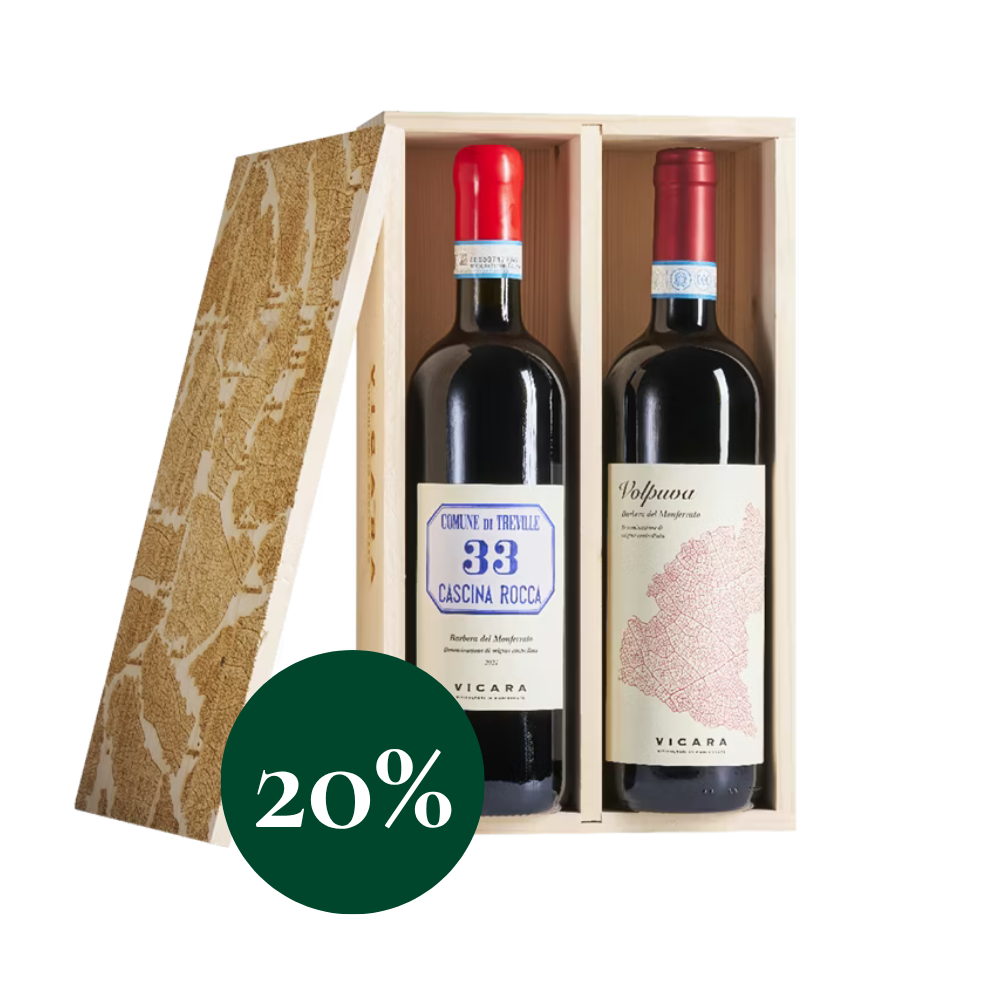 Two interpretations, one passion: Barbera. Cascina Rocca 33, powerful and elegant, embodies the essence of Monferrato tradition, while Volpuva adds a fresh and versatile twist, perfect for any occasion. The Barbera Vibes set pays tribute to Monferrato’s iconic grape with style and character, offering a unique journey through red fruit notes, freshness, balance, and depth.